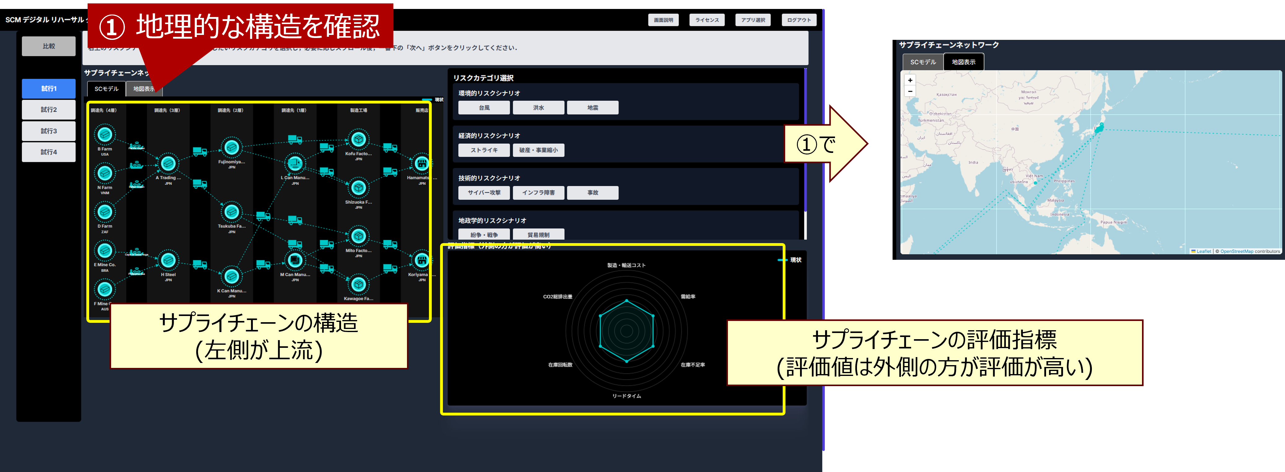 左はサプライチェーンの模式図です。上部の「地図表示」タブで地理的な構造を確認できます(①)。 右下はサプライチェーンの性能値(KPI)を表示しており、外側の方が性能が良いことを表しています。 KPIは、コスト、需給率、在庫不足率、最大リードタイム、在庫回転率、CO2排出量の6種類です。