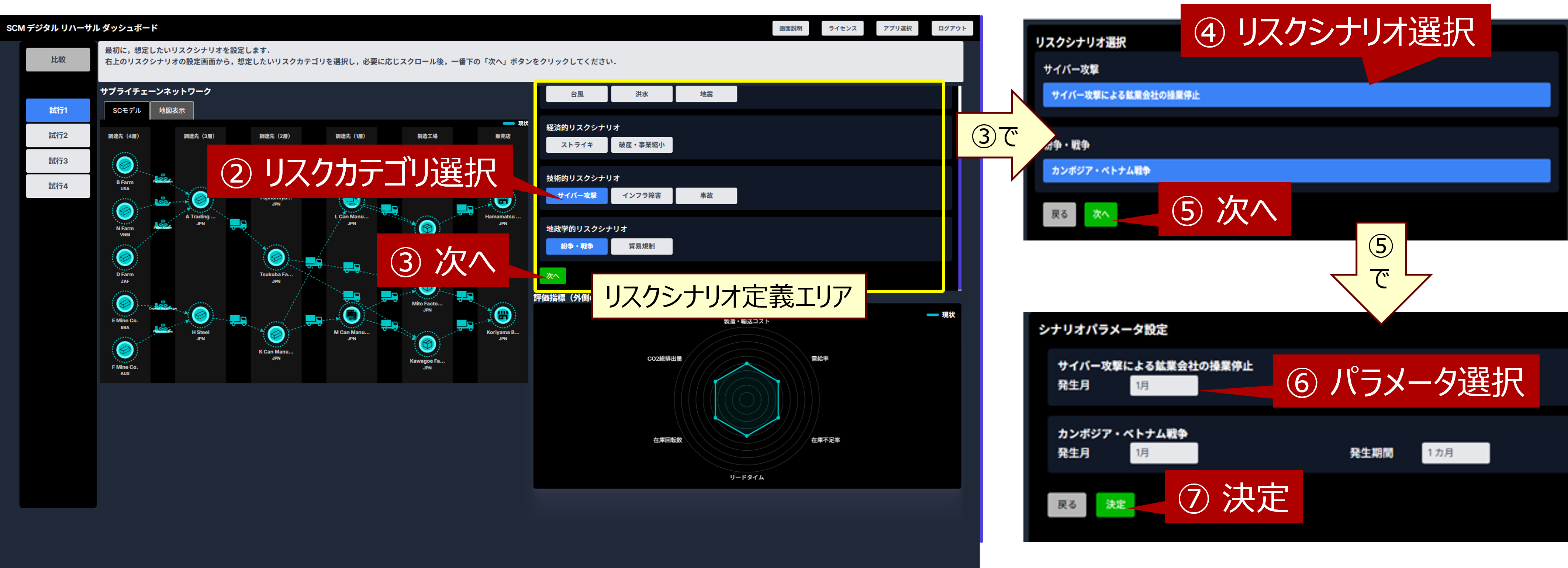 右上の画面でリスクシナリオの詳細を決定します。 リスクシナリオは、リスクカテゴリ(②~③)、カテゴリ毎に事前定義したリスクシナリオ(④~⑤)、リスクの発生時期や規模等のパラメータ(⑥~⑦)の順で指定します。リスクシナリオは複数指定可能です。
