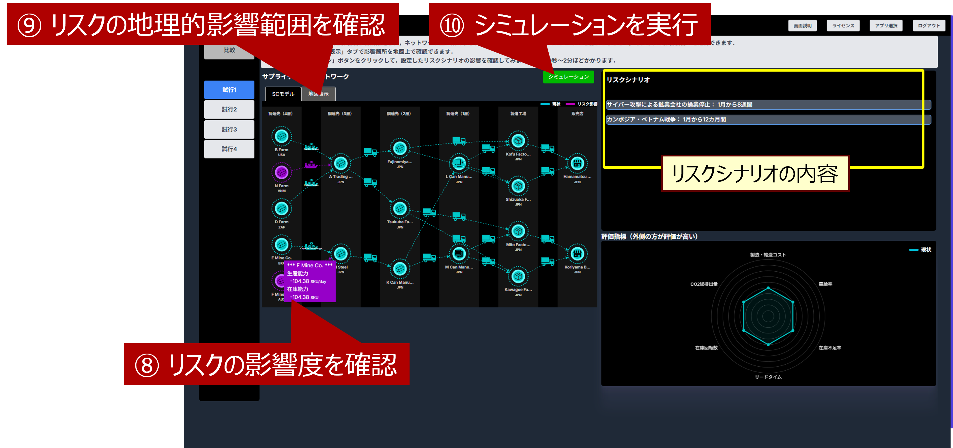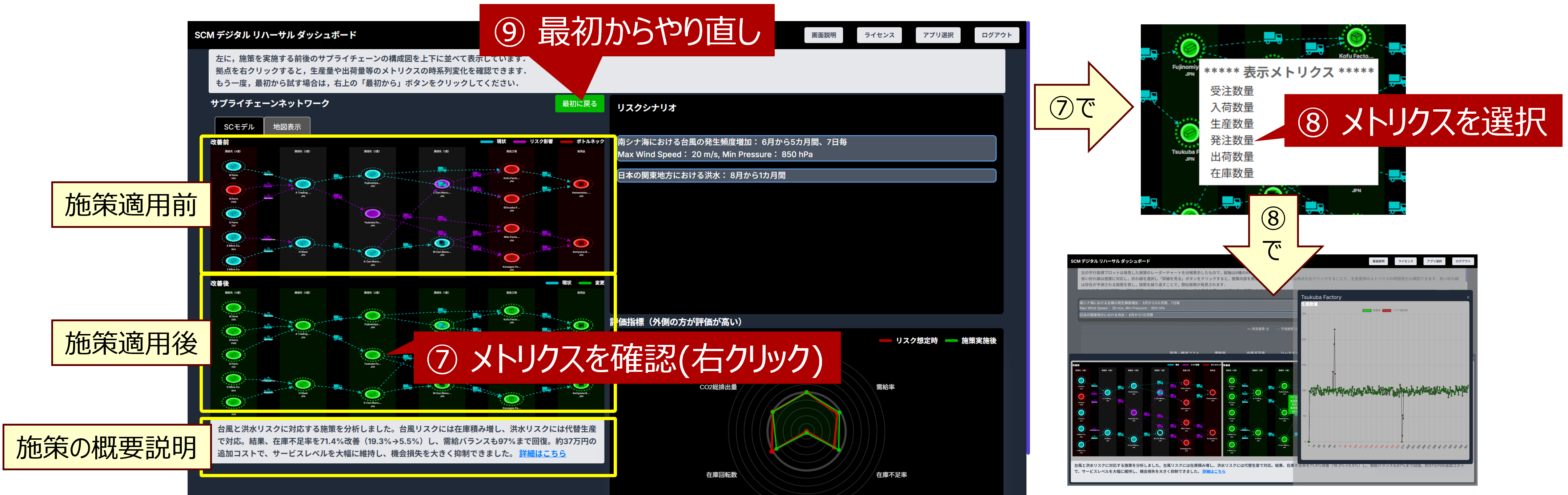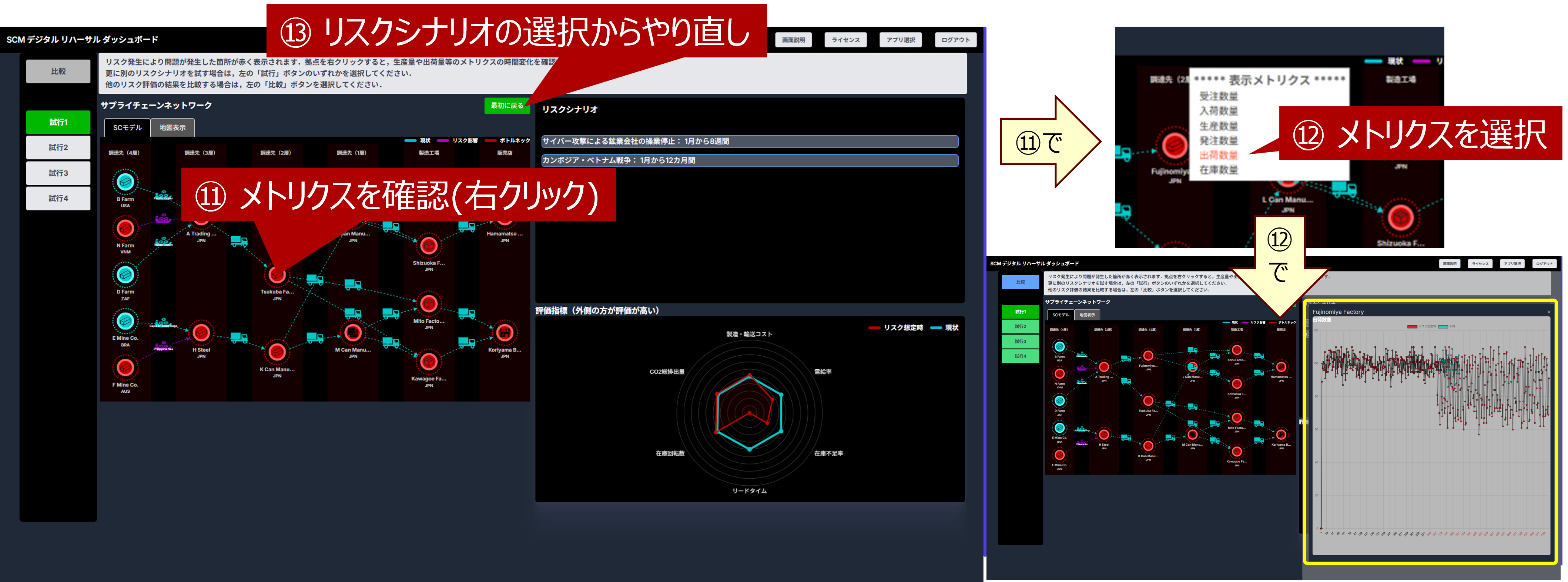 リスクシナリオにより問題が発生した箇所が赤く表示されます。右下のレーダーチャートは、平時のKPIを緑線で、リスク発生時のKPIを赤線で表しています。 構成図の拠点アイコンを右クリックすると(⑪~⑫)、生産量や出荷量等のメトリクスを確認できます。 中央の「最初に戻る」のボタンをクリックすると(⑬)、リスクシナリオの選択からやり直すことができます。