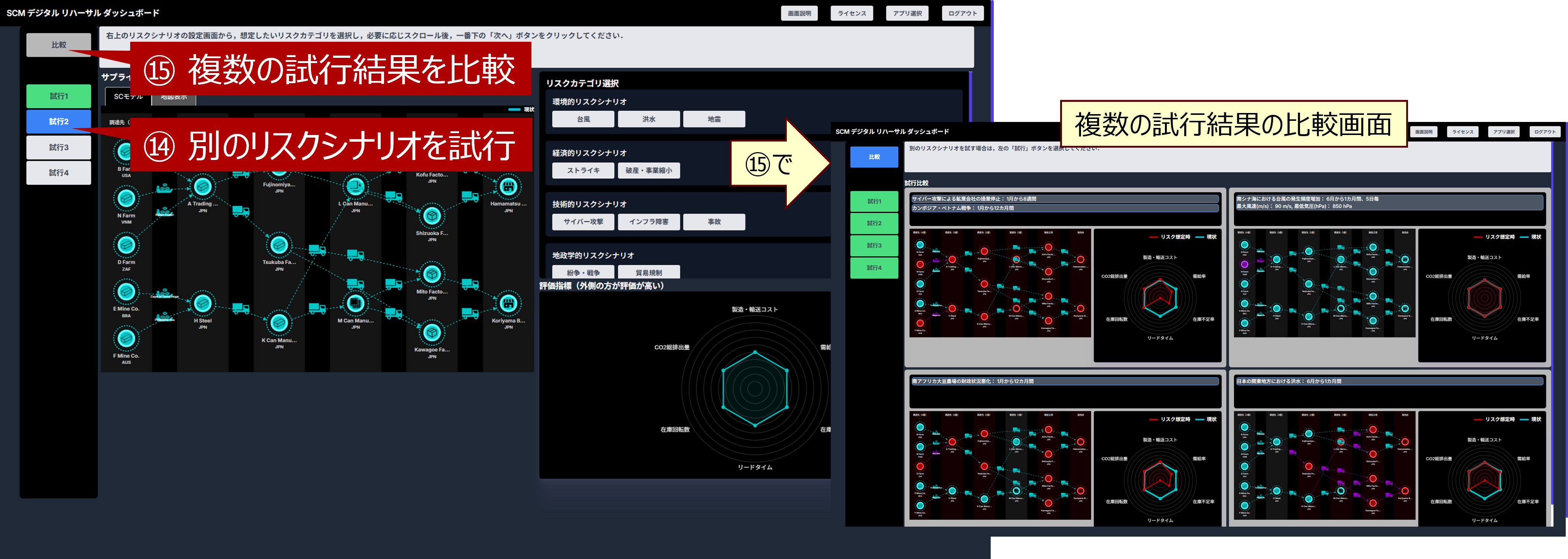 別のリスクシナリオを試す場合は、左の「試行」ボタンを選択してください(⑭)。その後の操作は、「1. サプライチェーンの平時状態確認」から「4. シミュレーション結果表示」までで述べた通りです。 「試行」ボタンは、アセスメント結果をまだ算出してないものはグレー、算出済みのもの緑色になり、2個以上の試行を行っていると、「比較」ボタンで算出済みの結果を比較できます(⑮)。最大4個のアセスメント結果を比較できます。