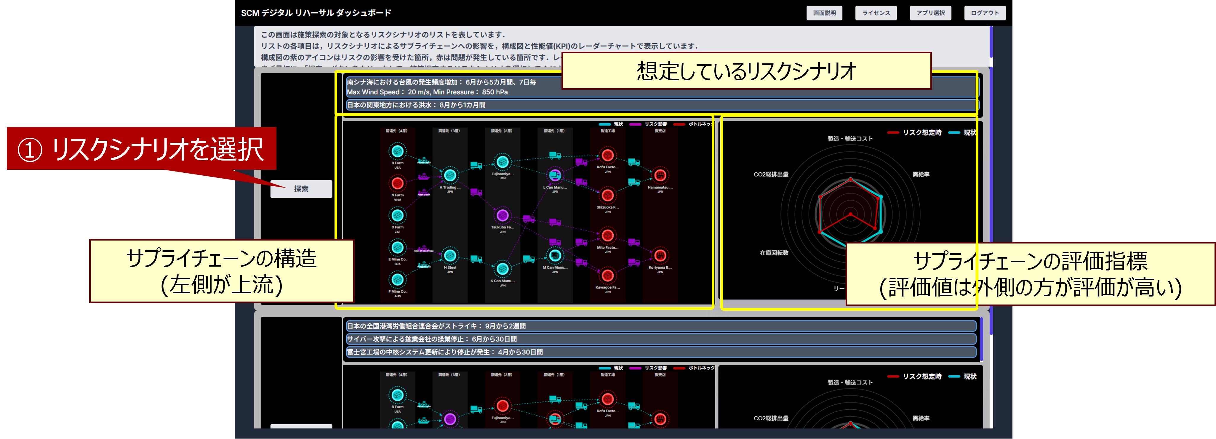 この画面は施策探索の対象となるリスクシナリオのリストを表しています。リストの各項目は、リスクシナリオによるサプライチェーンへの影響を、構成図と性能値(KPI)のレーダーチャートで表示しています。
