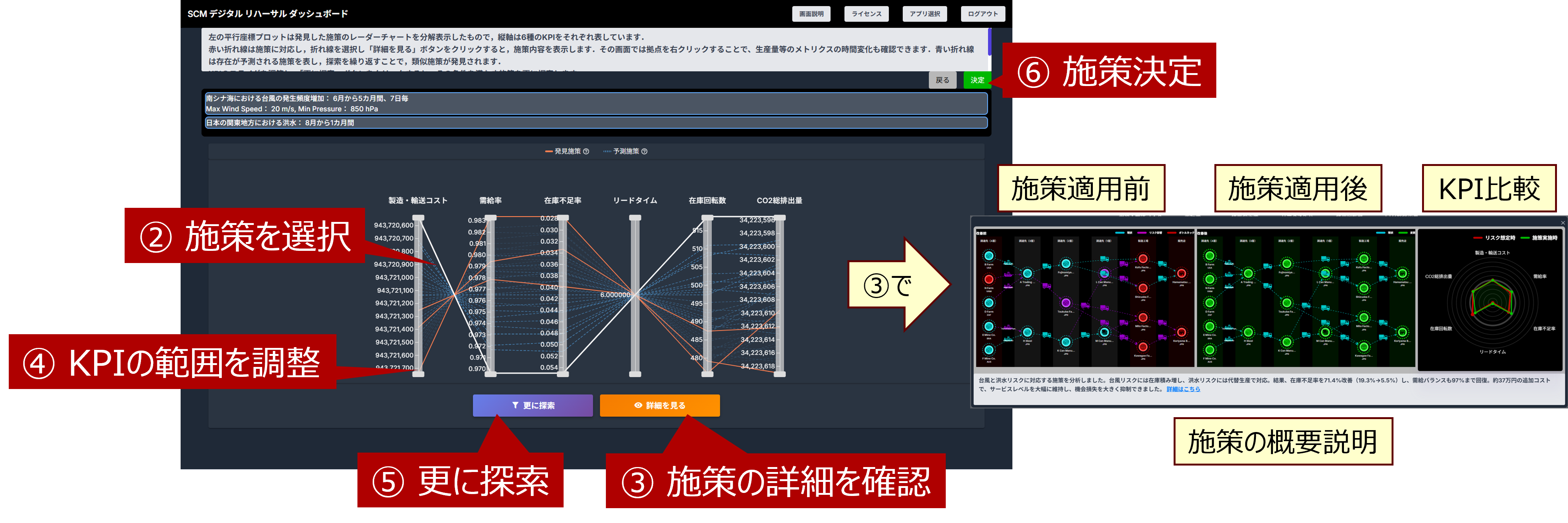 何回か施策探索を行い(④~⑤)改善施策が決まったら、平行座標プロットのその施策の赤線を選択し、「決定」ボタンをクリックします(⑥)。