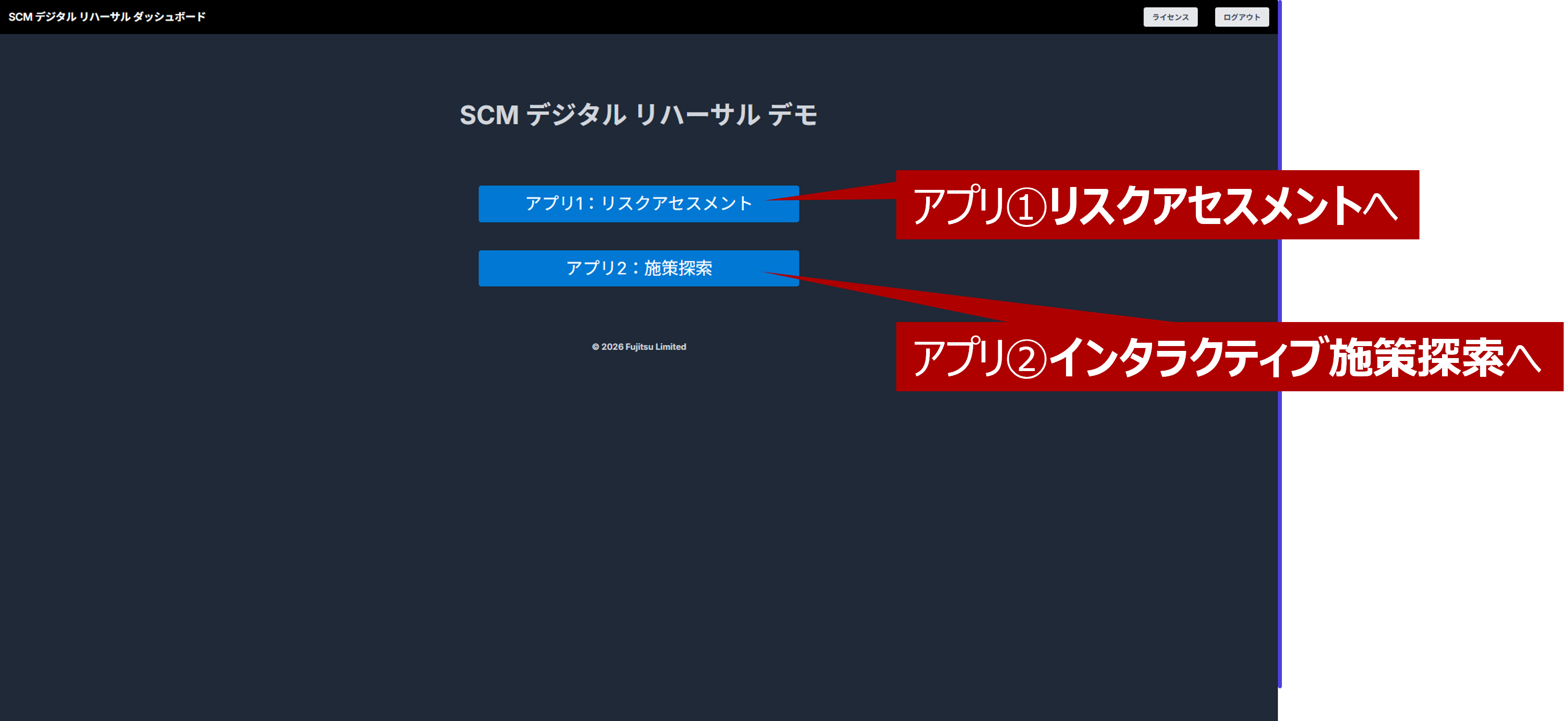 Fujitsu Research Portalの「サプライチェーン強靭化」技術説明ページの下部にある「デモ」ボタンをクリックすると、以下のアプリ選択画面が表示されます。